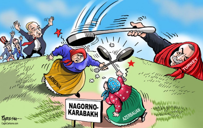 আজারবাইজানের পক্ষ নিয়ে তুরস্ক মাঠে নামলেও রাশিয়া ছোট ভূমিকায় কারো পক্ষ নিয়ে নামতে চায় না। কার্টুনটি করেছেন পরেশ নাথ - পলিটিক্যাল কার্টুনস ডটকম